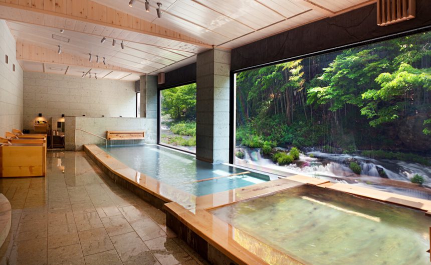 This inn is associated with Shosuke Ohara and has the scenic Fushimigataki Waterfall. The large baths and open-air baths with a view of the waterfall are truly spectacular. 6 private baths with a view are also popular. Every night, an outdoor Noh stage and lounge are used for storytelling and projection mapping. The lighting up of the Noh stage, bamboo grove, mountain stream, and waterfall will take you to a world of the ethereal.